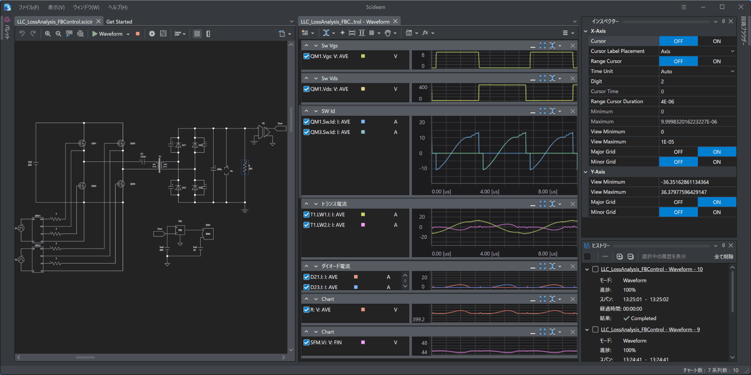 Scideamの損失解析は、解析区間を自動判定し、スイッチング損を自動分解、さらに、システムに含まれる全ての素子の損失を解析し、すべての構成要素に対して損失を一覧表示します。