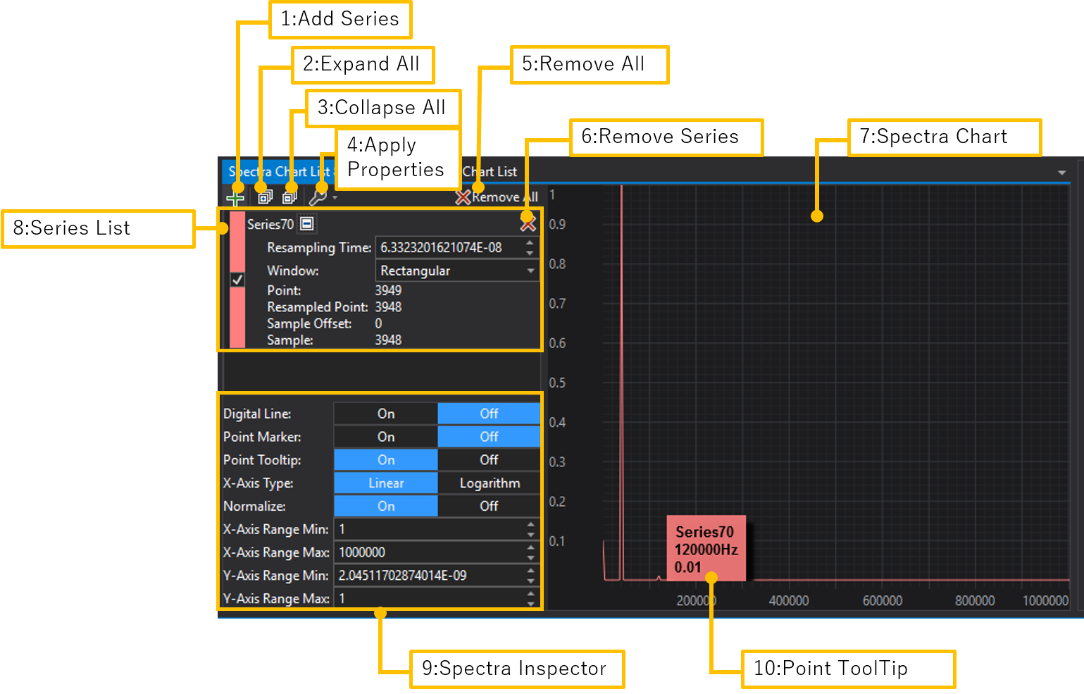 | 3 | Collapse All | スペクトル解析対象の全ての系列データの詳細情報を縮小します。 |