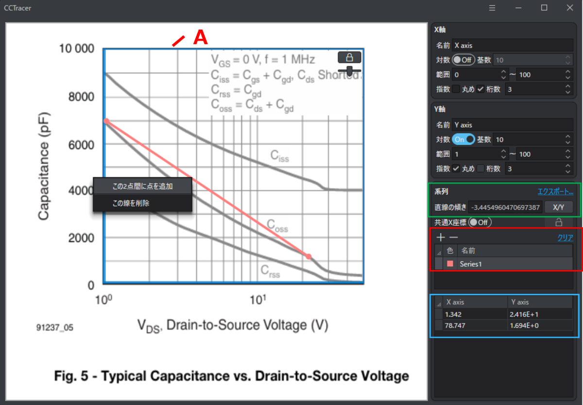 緑色部には系列線の傾きが表示されますのでボディダイオードのON Resistance等設定する際にご活用ください