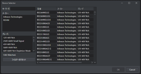 デバイスライブラリはルールに従ってデータシートより弊社で取り込んだパラメータファイルを使用しております。