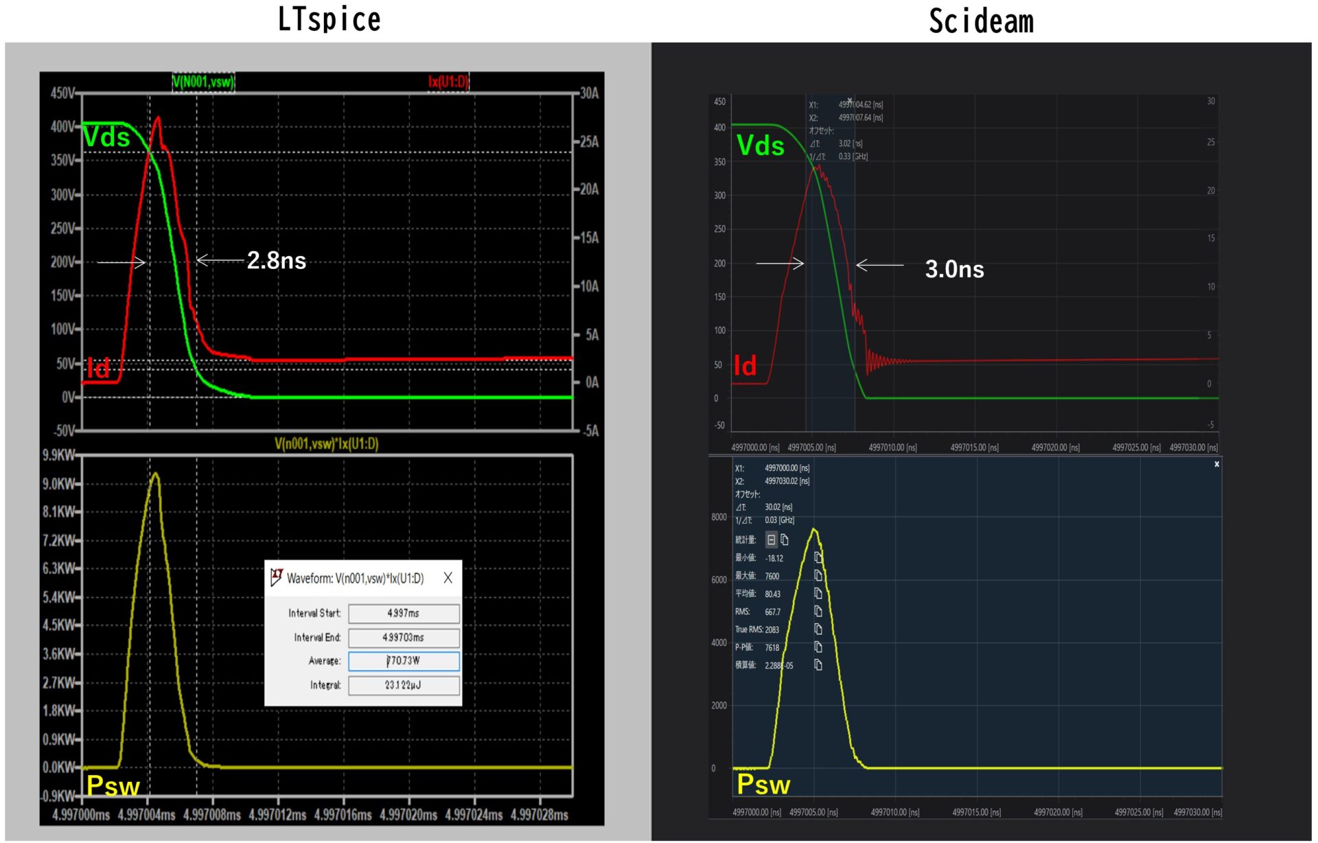 以上のように、この回路モデルのシミュレーション結果も、スイッチング時間、スイッチング損失共にほぼ同等であることが確認できます。