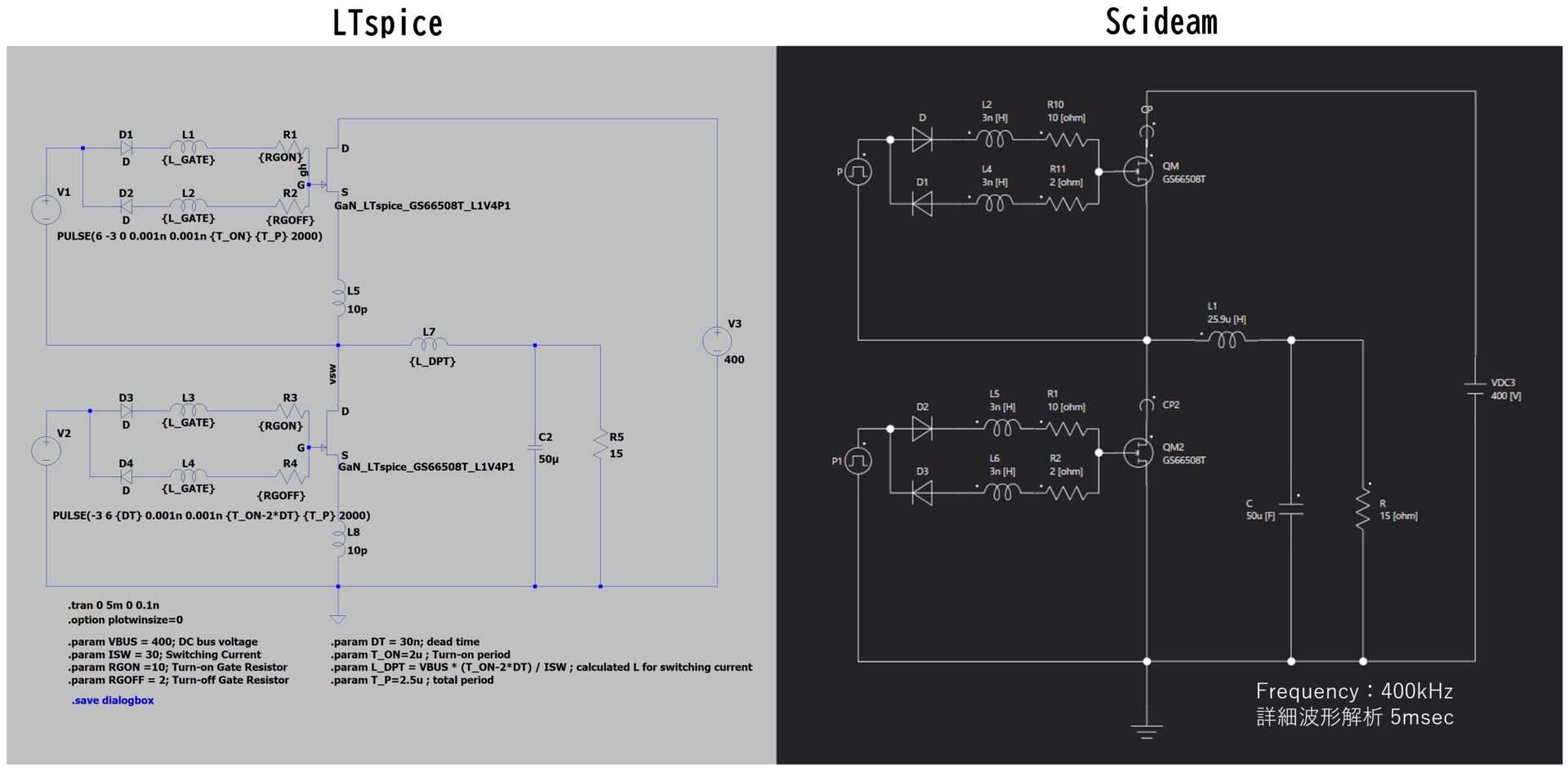 前回までに、LTspiceとScideam(サイディーム)のスイッチング速度とスイッチング損失について双方のGaNモデルが概ね同等であることが確認できました。