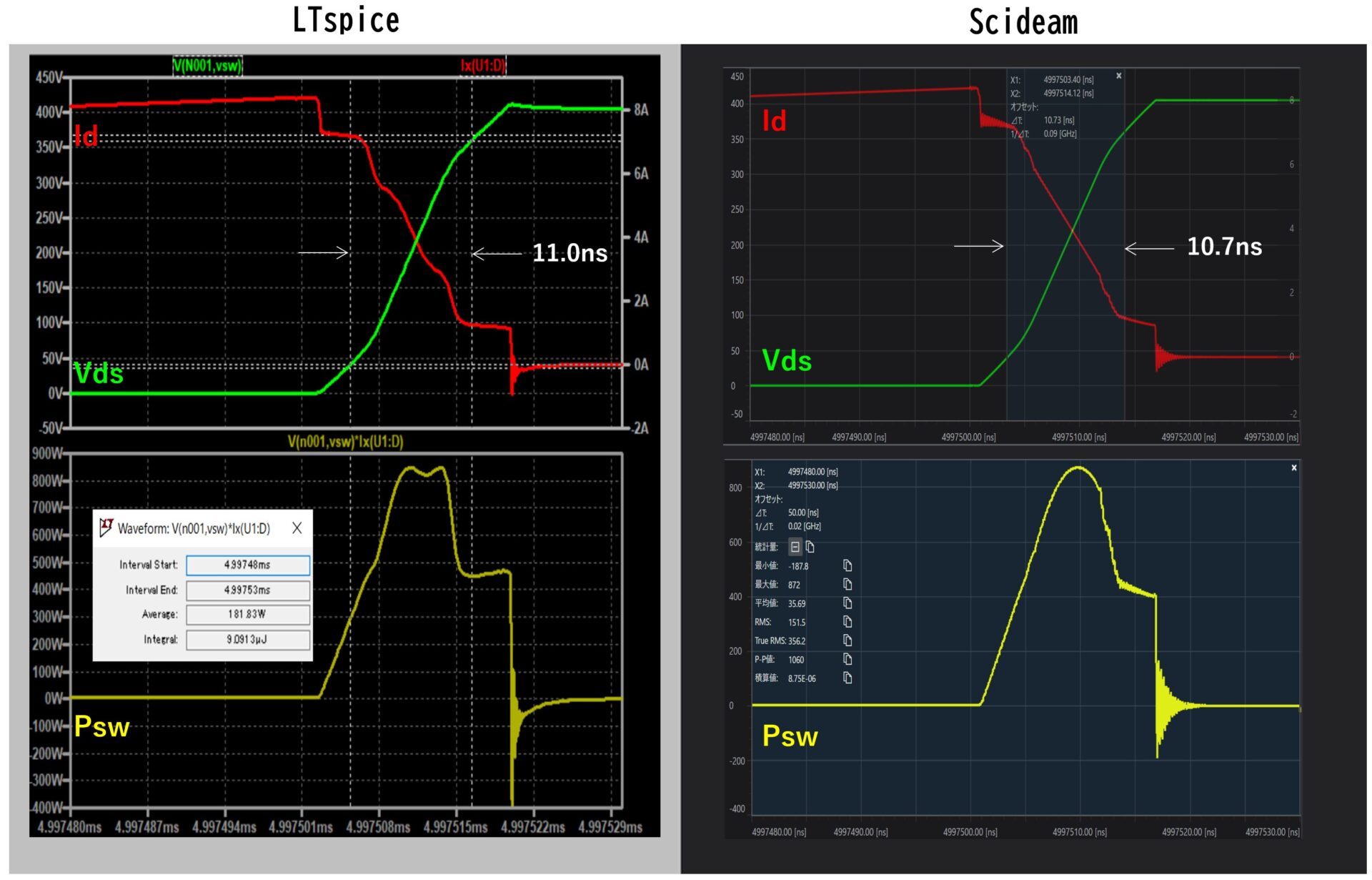 以上のように、この回路モデルのシミュレーション結果も、スイッチング時間、スイッチング損失共にほぼ同等であることが確認できます。