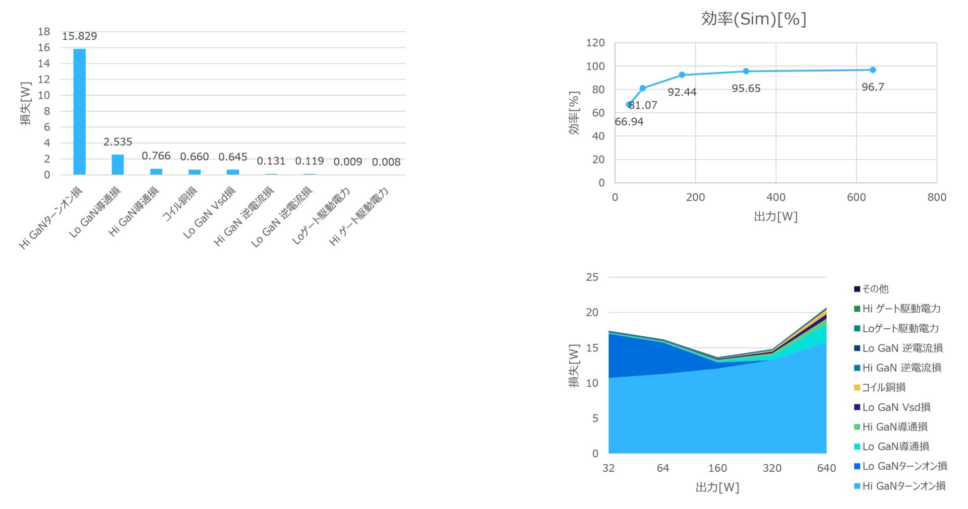 今回の記事では、LTSpiceとのGaNモデルの比較をテーマとして、詳細波形の積算値からスイッチング損失の計測を行いましたが、Scideamでは損失解析を実行すればこれまでの面倒な計測を行わずとも、”Power”モードで解析を実行すれば回路全体の損失リストを1クリックで取得することができます。損失解析を行った結果をエクスポートすれば、Excel等で図4のようなグラフの作成に活用できます。